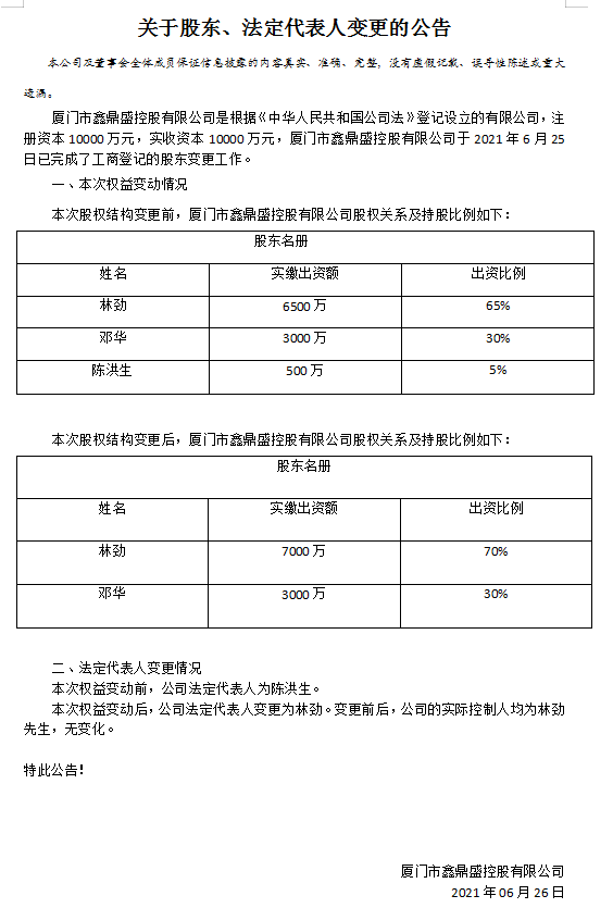 關(guān)于股東、法定代表人變更的公告